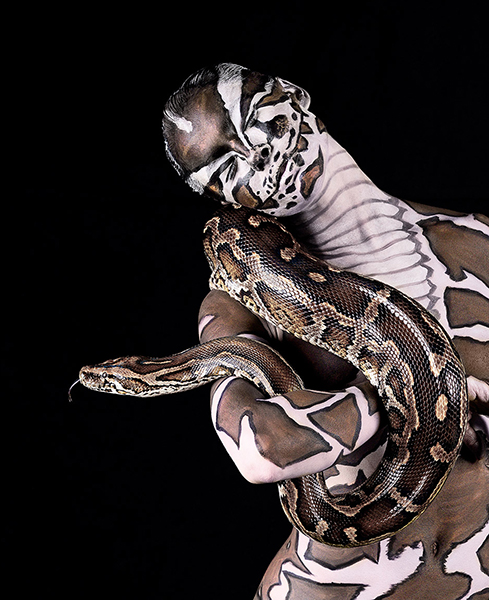 “Posing with them were Jasmina, Paulo and Kaela, who went through seven hours of make up, for four days in total. I wanted to show humans and their animal brothers in a new light that maybe hadn’t been seen before.The exotic animals came from in and around Los Angeles from renowned Hollywood and television trainers and we shot at the famous Smashbox Studios in LA. Each of the animals came with their trainers and every second they were observed and watched whenever the models came in contact with the animals. Some like Susie the elephant were fine to work with, the only problem she posed was how to get Kaela on top. In the end we used a long ladder and then we set about photographing inside the mammoth studios. For Jasmina and the cheetah and tigers it was bit different. We had to make sure that they were comfortable around her and that she had ample time to make a getaway should they become uncomfortable.”