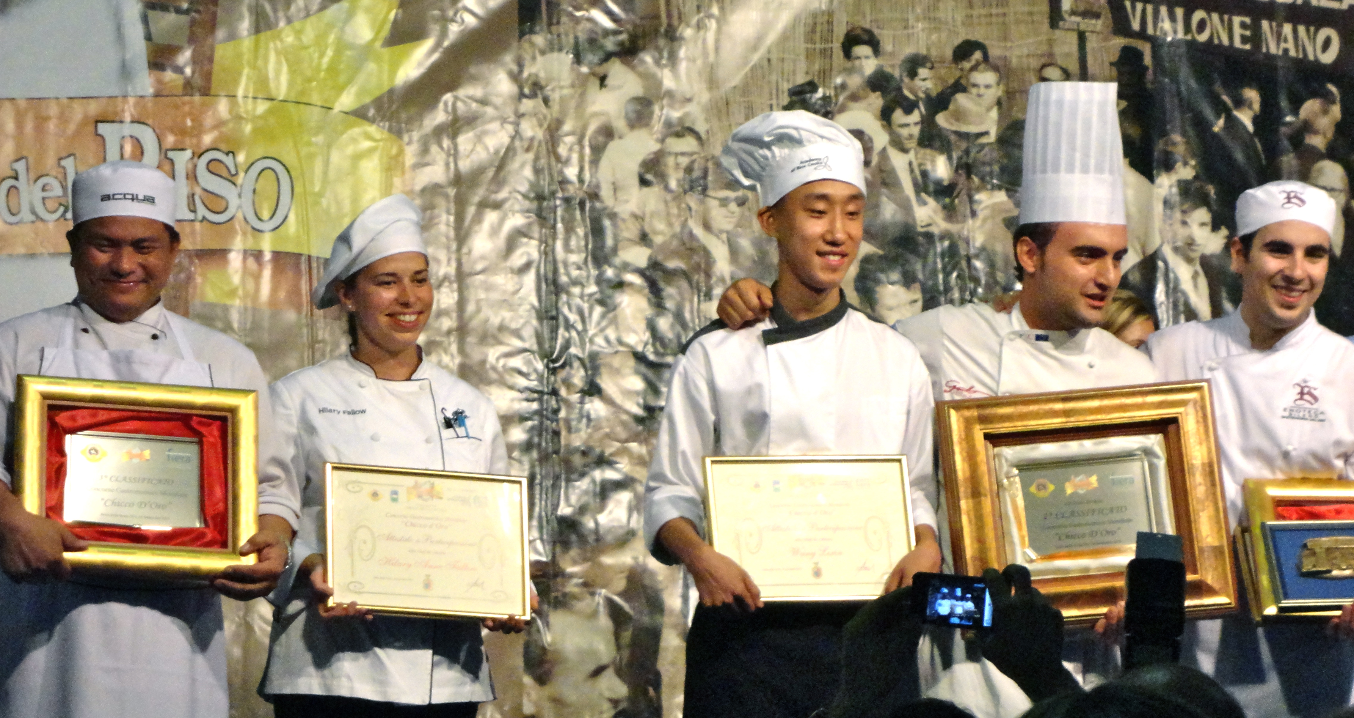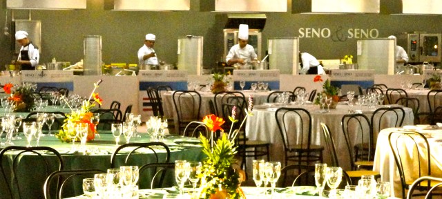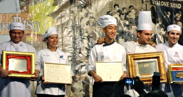 There are also cooking contests, eight of them. One is an event for the mayors of local towns. They are allowed the assistance of a chef they trust. The public can sample all five of the competing risottos plus beverage and dessert for a modest fee which goes to charity. This year a new competition for the “Chicco d’Oro” (Golden Grain) of the world took place opening night. The judges were seated and eating when the guests for the grand Gala Dinner arrived, walking behind the marching band that opened the fair. During an evening of delicious rice and wine, awards were given for outstanding local residents and at evening’s end, the judges’ choices were announced. An Italian from Puglia took first place with awards also going to Australian and Thai chefs. An American and a Chinese chef were also part of the five competing finalists. Chatting with one of the other cook-off spectators, I discovered she was the mother of, as well as interpreter, for the Australian Chef. She was delighted to be back in Italy, where she was born, for the first time able to watch her son professionally cooking, as opposed to what he does in her home kitchen.