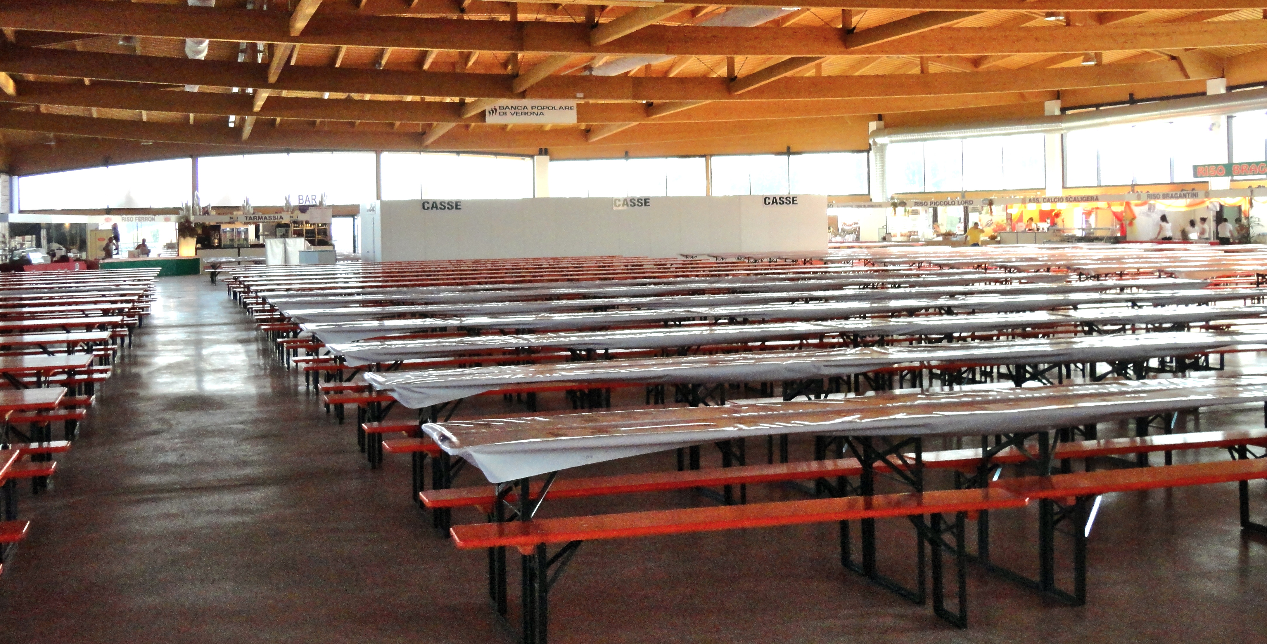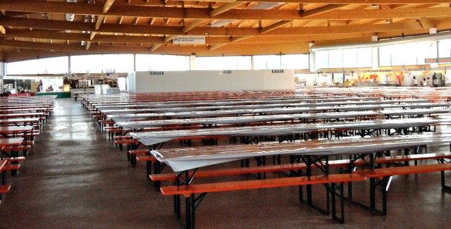 There are two huge eating arenas filled with long tables and benches, food stands line the walls. There is no table service. You buy tickets for your food, wait in line and tray firmly gripped, grab places squeezed in with enthusiastically eating strangers. The lines can snake back and forth, five or six rows deep. The strangers may have driven hours from Bergamo just to indulge in three or four plates of different risottos washed down with good local wines from Valpolicella, Suave, Custoza or Bardolino. And they come back year after year.