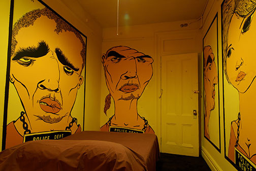 For the second room, which I painted on my own, I knew right away that I wanted to paint large haunting faces. That led me to the idea of creating mug shots. In preparing for the project I did a ton of research on old mug shots from the 1920’s and 1930’s. Every single person that appeared in these shots looked like serious characters. As I flipped through them I thought to my self, “what did this person do? What went wrong? How did they get caught?” I was amazed at how one single photo, in this case a mug shot, could spark so many specific kinds of questions. I wanted to create those same questions for someone else with my own characters. It was a very simple idea that I could execute rather quickly, so I went for it.