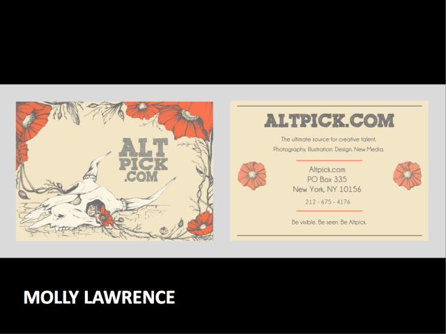 Julie Lieberman from SCAD, Savannah College of Art and Design, recently invited me to speak to the illustration department students about marketing and promotion. We made it fun with a contest to design an Altpick postcard that would be sent out to art directors and creative directors in the industry. At the end of the presentation, we reviewed the finalists and announced first, second and third place winners. Not so easy. The concepts and illustrations were incredibly well-done. Here are the runner-ups:
