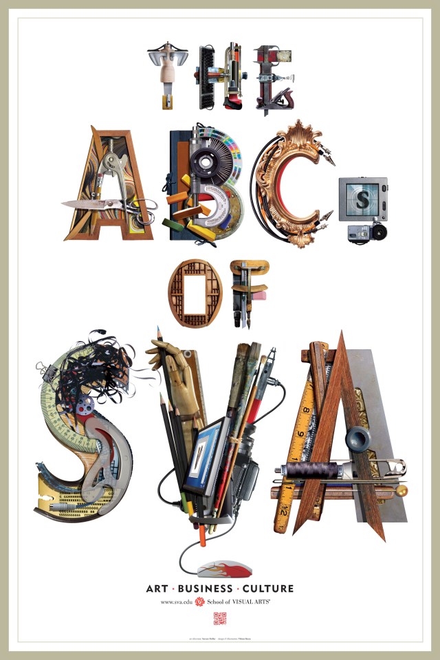 Here, letters fused out of art making utensils (I photographed everything I had from the old days, including the contents of boxes that haven’t been opened for decades, but also secret photo shoots in art stores and tools that SVA students at the MFA illustration program were kind enough to part with) formed a simple line that drove a complicated message. Change your life by making art part of your vocabulary, one letter at a time.