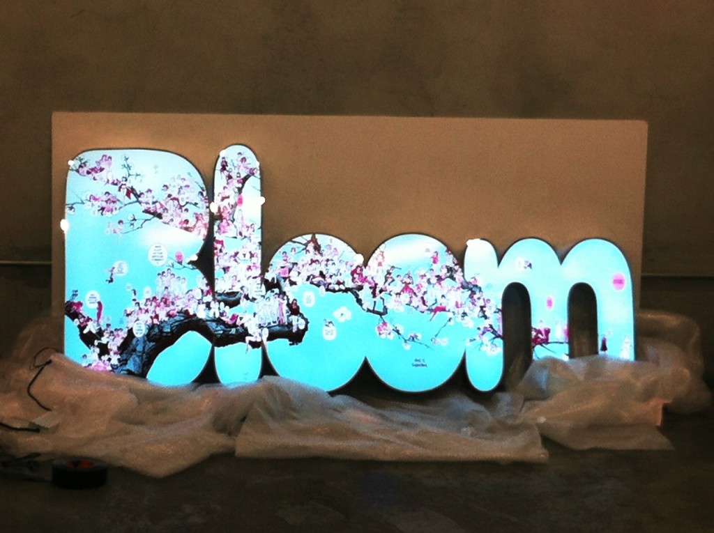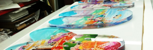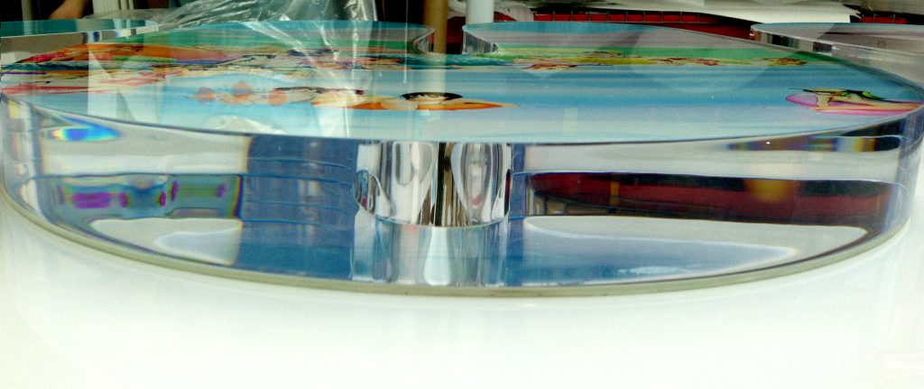 Duggal created lightboxes and large plexi pieces for the artist. For the plexi pieces, the prints were mounted to layers of custom cut, thick plexi and attached to a backer. The plexi pieces were laser cut to size with bevel edges and polished with diamond router bit. Plexi braces were adhered to the the plexi pieces (plexi to plexi bond is the strongest bond there is) to support close to 500 lbs. Check out the photos below!