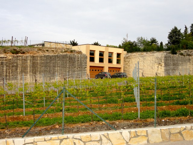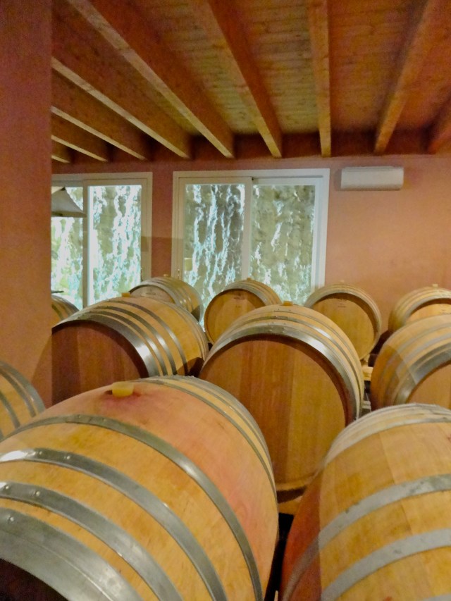 We traveled up a winding narrow road with sharp turns where cars had to stop, half pulled into side roads, to let other cars pass, classic Italian countryside driving. We kept our eyes out for the name Piccoli and were almost ready to turn back, when; there it was, perched high on a hilltop. And what a surprise, the new and modern building with clean lines was built, inserted into the rock face of an abandoned quarry! Talk about recycling! They told me that the surrounding stone walls are also good for the aging wine; keeping it in nature and helping to maintain the stable temperature.