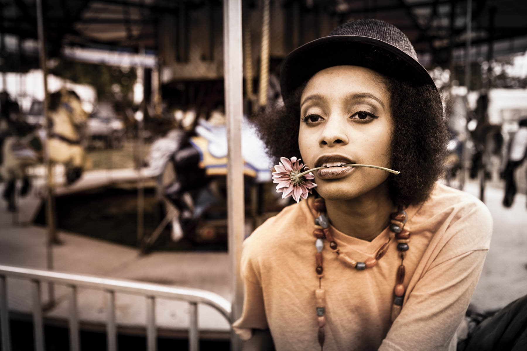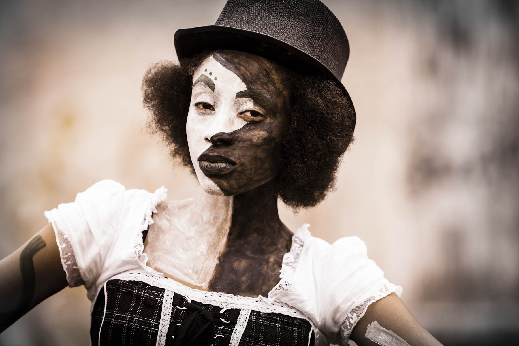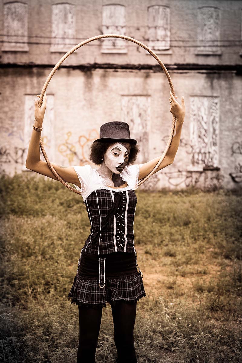 Sometimes we shoot with a game plan and with a layout in hand. Other times we just go into the visual kitchen with various ingredients to see if we can cook something for supper. My shoot with Yandea was a box of flour, a quart of milk, an egg, some chicken and a few different unlabeled jars of seasonings. When I looked at her outfit I thought, “let’s paint her face in black and white.” When I saw an empty field near her home, I grabbed a hula-hoop. Yandea also wanted to shoot in a colorful peasant dress so over to the Carnival we went, dress on, searching for the fun.