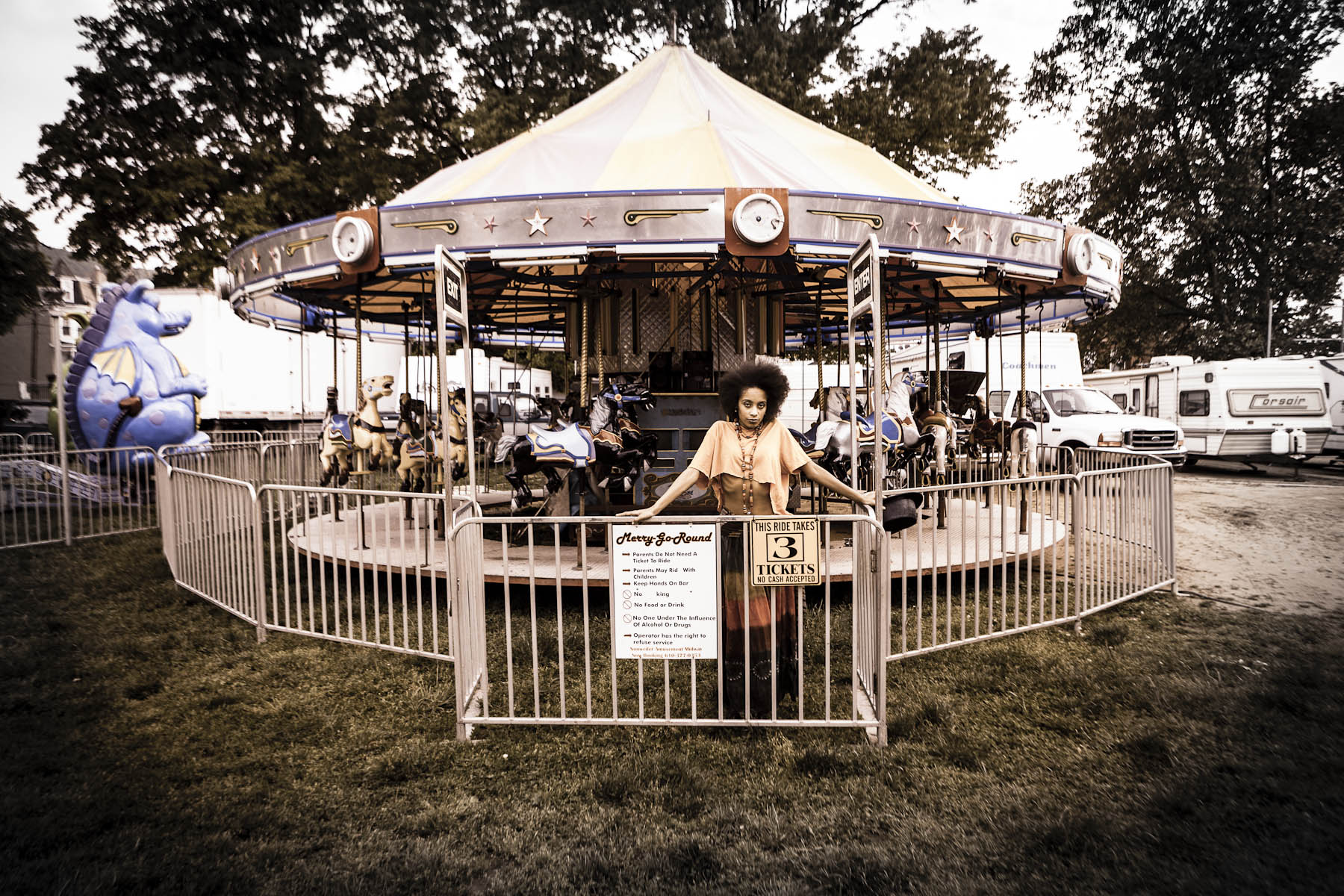 Yandea, my subject, is beautiful, smart and knows her art history. On the phone she mentions she has a black and white dress, she mentions that she does not have a car so we are going to have shoot near her home, she also mentions that there was a small carnival a block away. With visions from “The Night Circus” in my head I drove out to Reading.