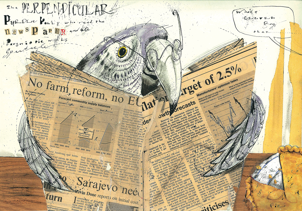 GB:  This parrot illustration was a follow-up to the fish piece. I experimented again with collage and used real newspaper to emphasise the fact that the parrot is actually reading a paper. I did a series of these illustrations based on the poems of Edward Lear and this got me started on the editorial illustration highway….