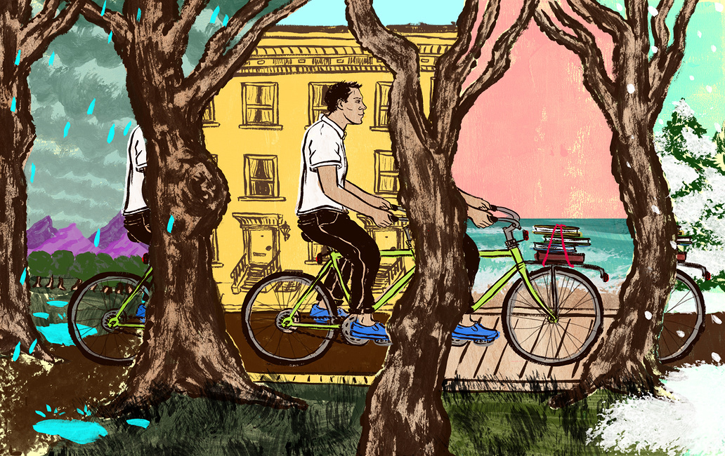 DF: Not long ago, I started working in a limited color style along with my painted work. I’m doing this to not only offer something more bold and graphic but to challenge myself to make something more minimal and to the point. Not everything needs to be a landscape of detail. This piece was done for the Globe and Mail for a story about a woman who loses her job and realizes that her identity is completely wrapped up in what she did for a living. A consistent conversation I have with my studio mate is about this very subject. Are we our work? I like to think that the majority of it is an extension of myself, but when does the identity of the illustrator end and where does Daniel Fishel begin? Making an image showing a invisible business women looking at herself in sweatpants and a t-shirt seemed like an obvious answer to show her externalizing this question I often times pose to myself.