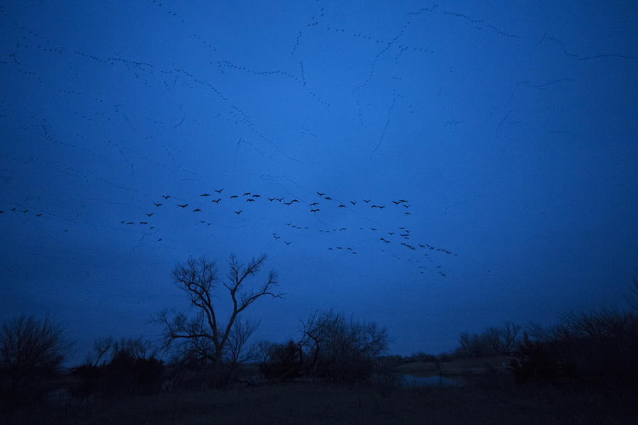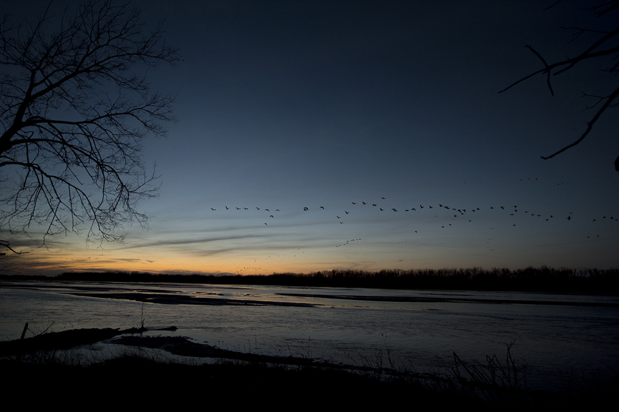 We had a pop-up blind tacked down on the small piece of land right in the middle of the Platte. We knew there was a whooping crane in the area, and we knew the sandhill cranes and snow geese were maybe 30 minutes from starting to glide down to their overnight resting places. I was soaked. But no time to head back to get dry clothes. It was going to be a very long, cold night.