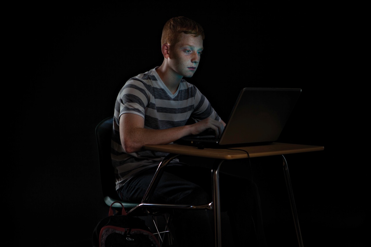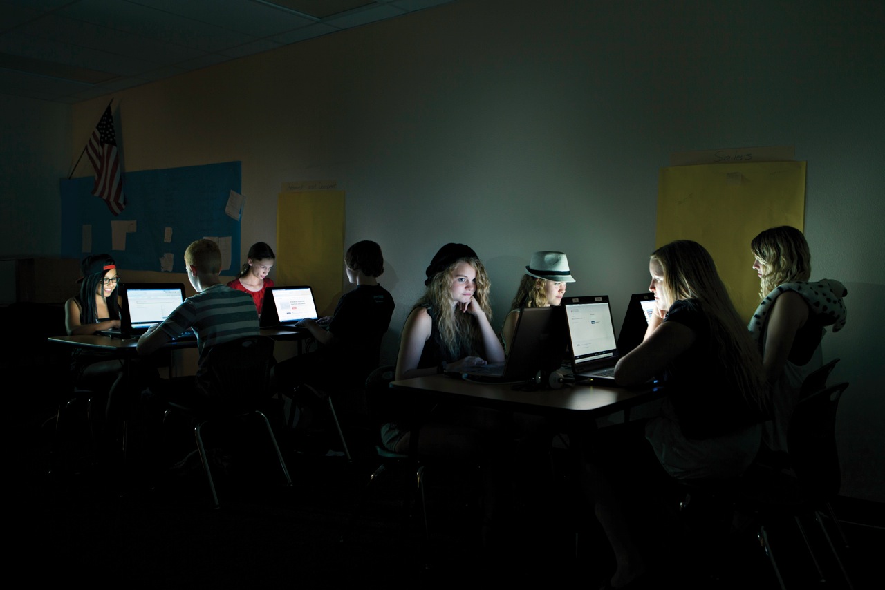 EC: Well, originally when I spoke with the art director for the story, he referenced a shot of mine that he saw on my website of a man sleeping on an airplane. His face was lit by the small TV screen in the seat back. He really liked the light and the moodiness of the image and wanted to go in that direction with the images for this story. We talked about how to incorporate something as aesthetically unappealing as someone sitting at a school desk computer into an interesting image that told a story of interaction between the student and machine. I was really glad that he didn’t want something straightforward and that I had some creative freedom to do something interesting with light. That resulted in the dark images of the kids at the screens. We essentially built a small black cave in the gymnasium of the kids’ school with large flags, C-Stands, and black seamless. The shutter speeds were slow in order to pull the glow off the laptop screen, so the kids had to be pretty still. That was the first challenge: getting an expression that did not appear posed or static and then getting the kids to hold it. Middle school school kids are crazy, there’s just so much going on in their heads. If as a director you can get some of those insecurities, random thoughts, humor, or obnoxiousness out of them, it makes a great image. It was really fun interacting with them and coaxing them out of their high school shells. So much fun that we decided to try another treatment while we were there. We went with a standard blown out white background portrait set up and just got the kids in front of the camera. They were all stoked to be out of class and were just hanging out and teasing each other. I was listening to them and remembering how much I hated high school, but the more I listened and watched them the more I started to see who they were and I got an idea of who was going to do what in front of the camera. I saw what their personalities were like, they were all so different, and my goal was to capture that.