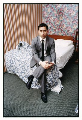 With an increased budget for his personal wardrobe, John Lloyd developed a taste for John Varvatos (I think Varvatos provided John Lloyd with a tuxedo in which to receive his Tony). The Hotel 17 shoot featured a beautiful grey flannel Varvatos suit he had recently purchased. Although, he has a beautiful, engaging smile, JLY mostly preferred the shots in which he looked wistful, intense or downright miserable. The shot here is from the room at Hotel 17 – JLY called it the pinwheel shot.