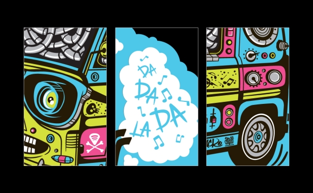 Lacko set the project in motion with a goofy band bus that’s kitted out with giant speakers, filled with miles of tangled wires and Grammer’s dog at the wheel. The van has cheap sunglasses across the headlights and a wide grin spreads along the grill. To give the sloppy jalopy added appeal, clouds of smoke belch from the twin tailpipes that billow into happy clouds of music. The van bounces across the highway making a joyful noise wherever it goes.