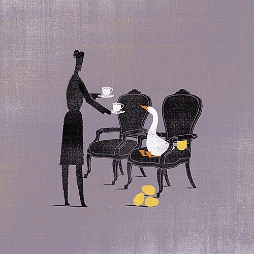 Woman serving tea to Goose seated in parlor chair, surrounded by Golden Eggs
