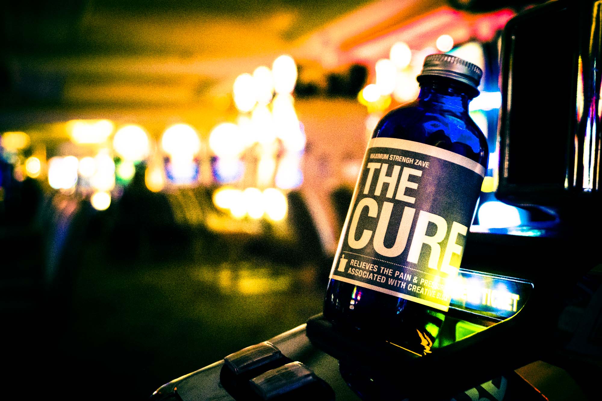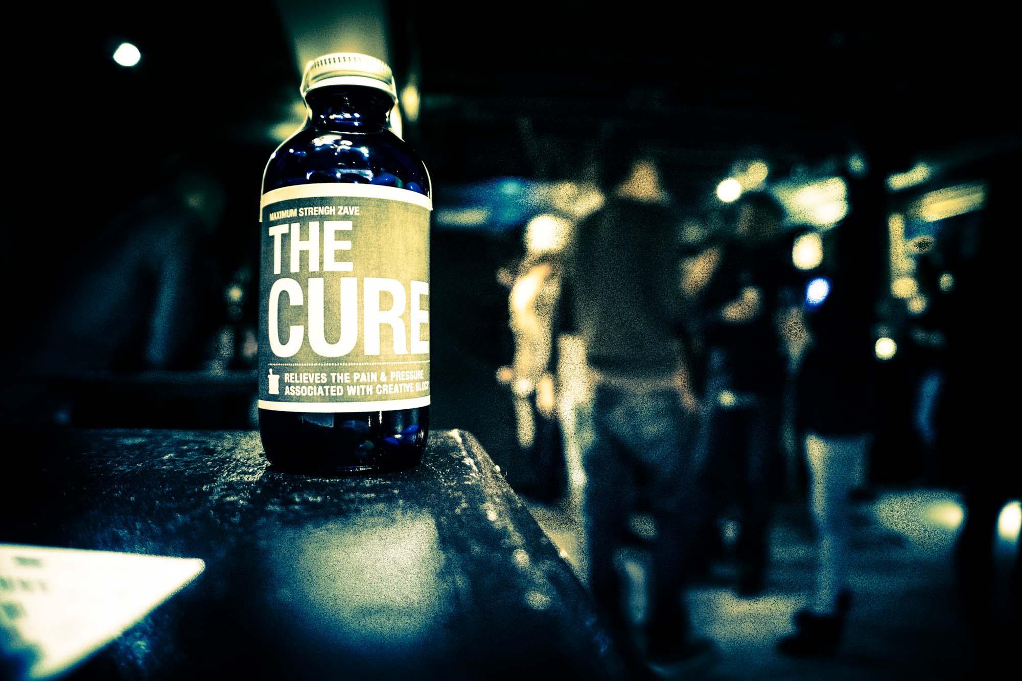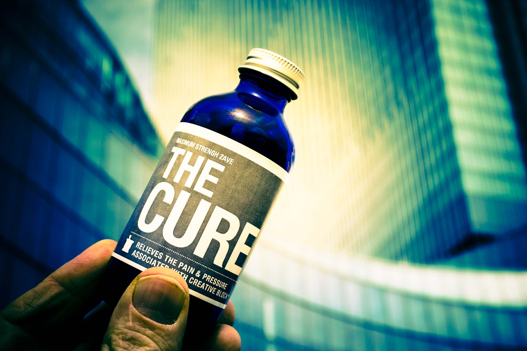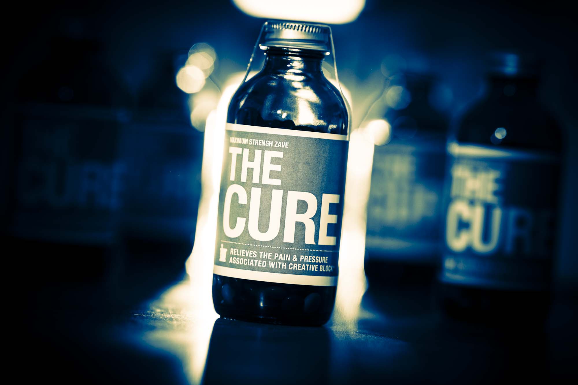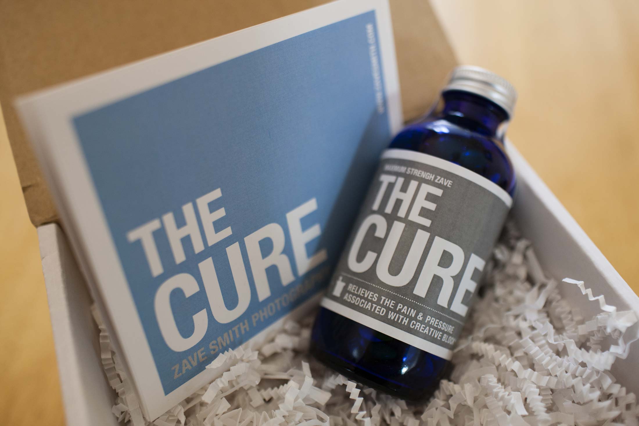 “The Cure” is a beautiful 8oz blue glass bottle with a silver cap that contains miniature M&Ms. These bottles are wrapped in a silver label that reads, “The Cure: To cure creative block take two and call, Zave”. This bottle sits on top of a tri-fold brochure of my images. The bottle and brochure are then nested in white crinkle paper and packaged in an attractive box with “The Cure” stamped on it.