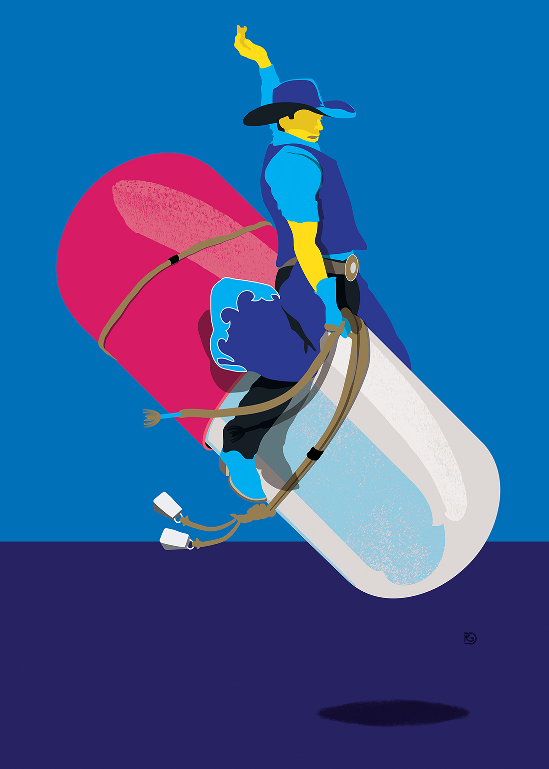 A cowboy, riding a ‘bull-like’ opioid pill.