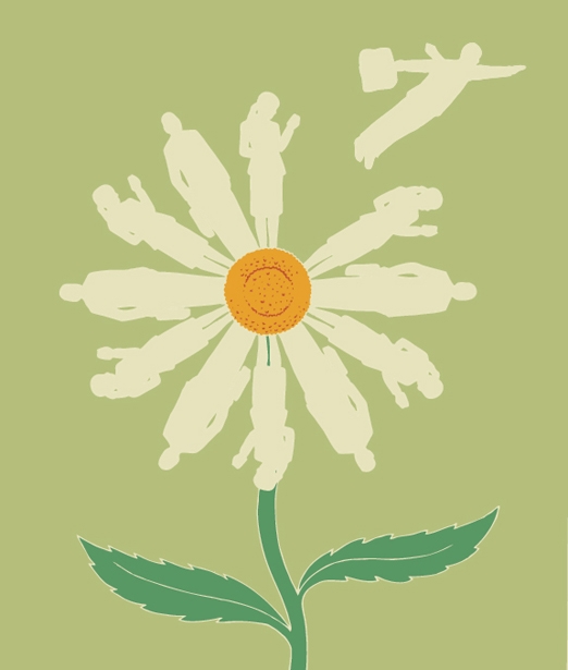 This vector based, conceptual, editorial digital illustration shows businessmen with briefcases and businesswomen with cell phones as flower petals. One man is flying away. The other men and women are next to fly off.