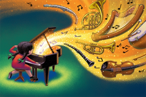 This is a digital illustration to be used for a greeting card, advertisement, children’s book, textbook, music book depicting a young girl playing a magical grand piano bursting with notes and musical instruments: drum, harp, flute, violin, trumpet, clarinet, french horn.
