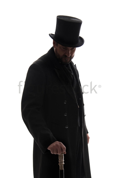A Victorian man in a hat and coat, standing with a cane, in silhouette – shot from eye level.
