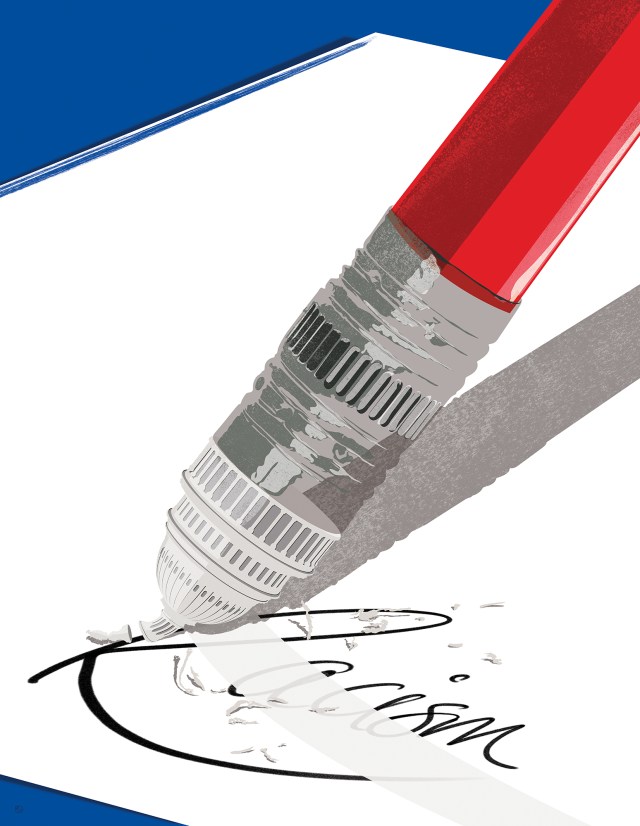 Paul re-interpret a previously produced piece of work showing a crumbling Capitol Dome as an eraser, trying half-heartedly to eradicate a huge problem. ‘Black Lives Matter’ – ‘All Lives Matter’. “If we all treat each other as we would like to be treated, regardless of creed, colour, religion, etc and drop the attitude we would all get along perfectly!” —– Paul Garland