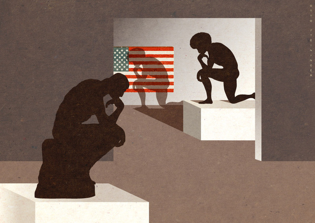 “Colin Kaepernick created an image of protest against systemic racism three years ago by taking the knee. Though in this illustration I am suggesting that Kaepernick is brooding over an intractable problem and that it is leaving a dark shadow on America, the fact that even cops are now repeating this gesture to show solidarity with protesters against racism gives me a sense of hope that this time around things are different and that George Floyd did not die for nothing. In several cities, attempts are being made to directly combat brutality and racism at police departments. It is a painful moment in history, but I see something bigger shining through.” — Otto Steininger