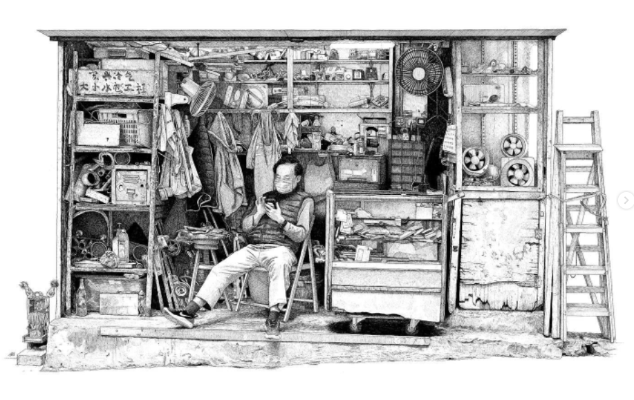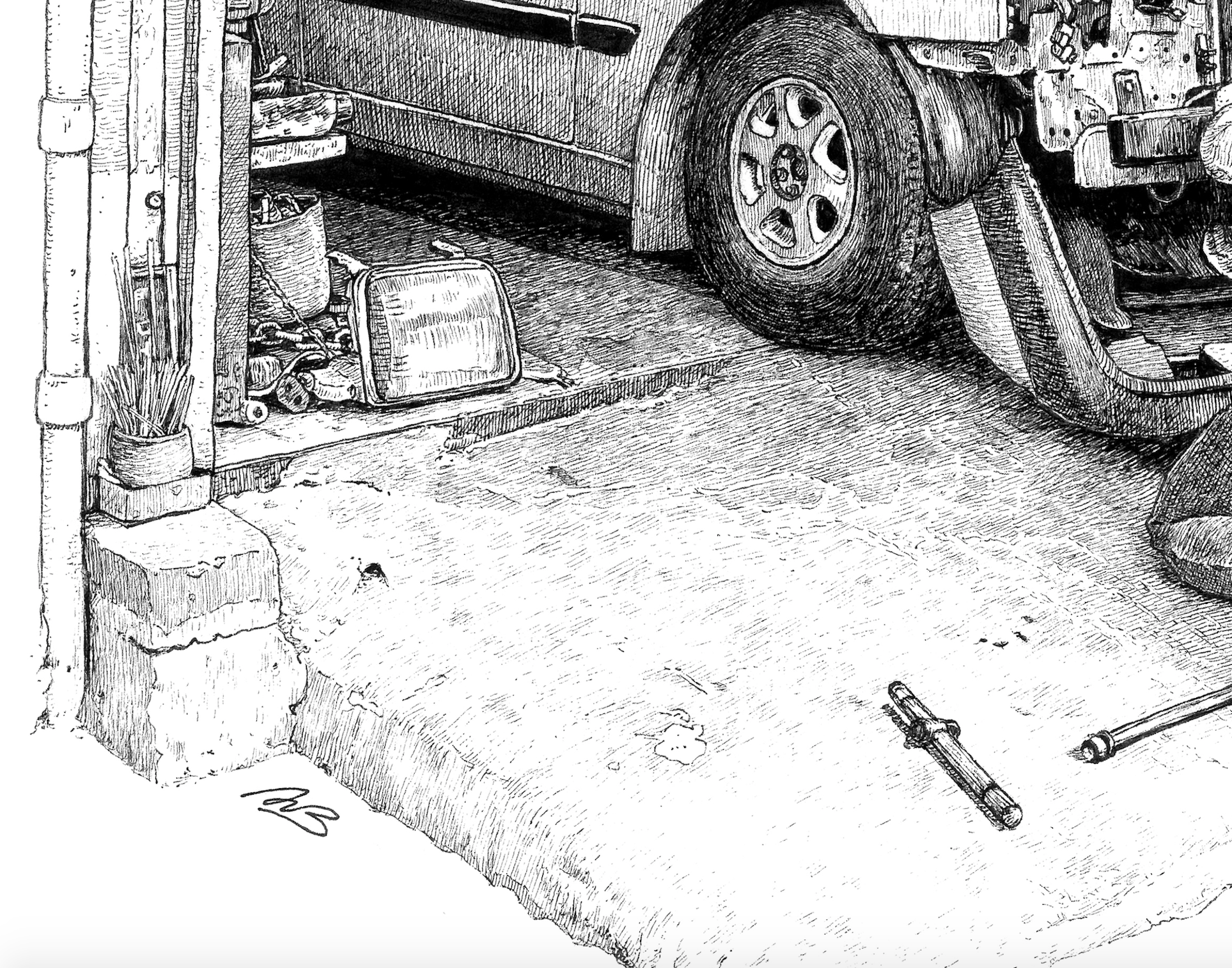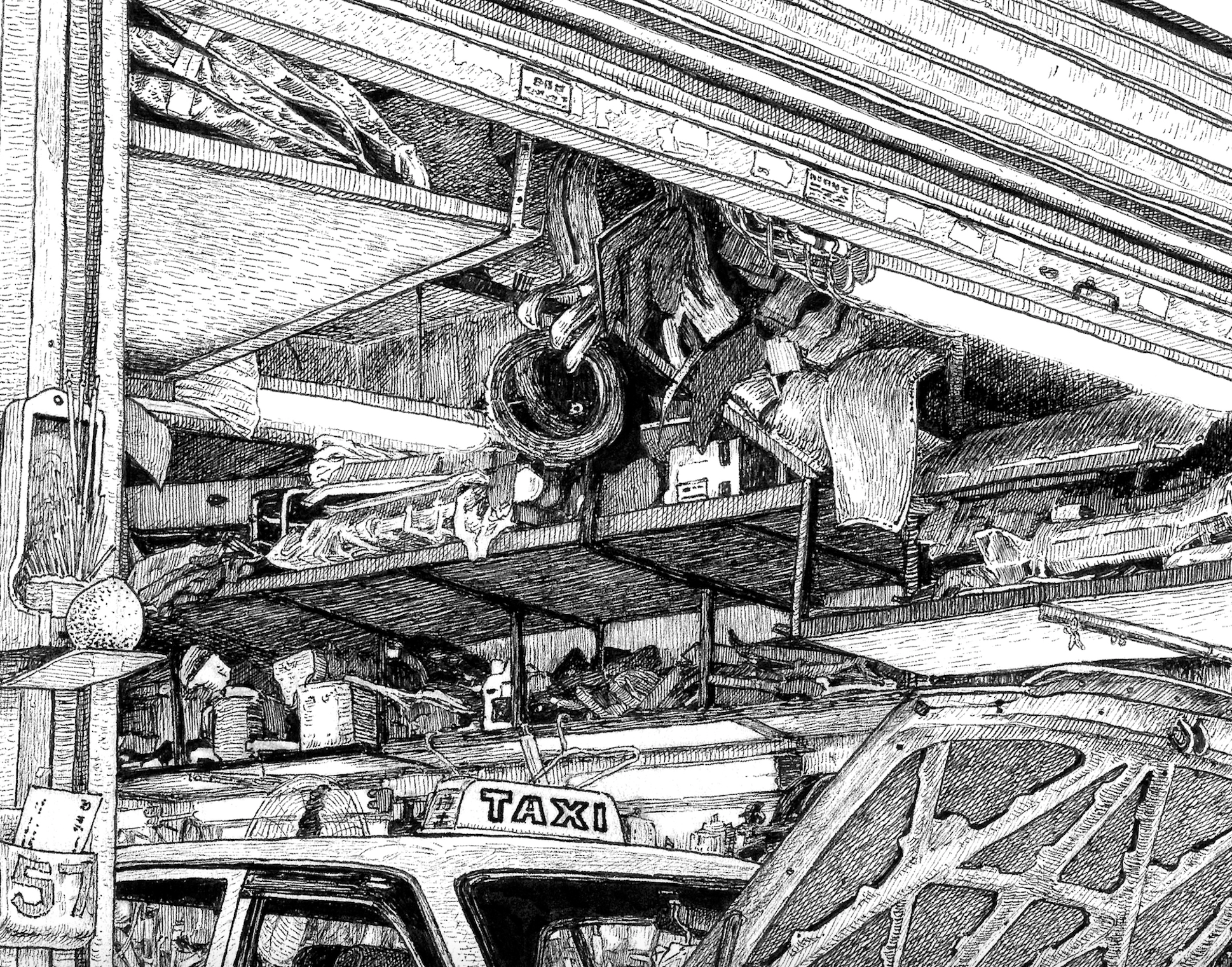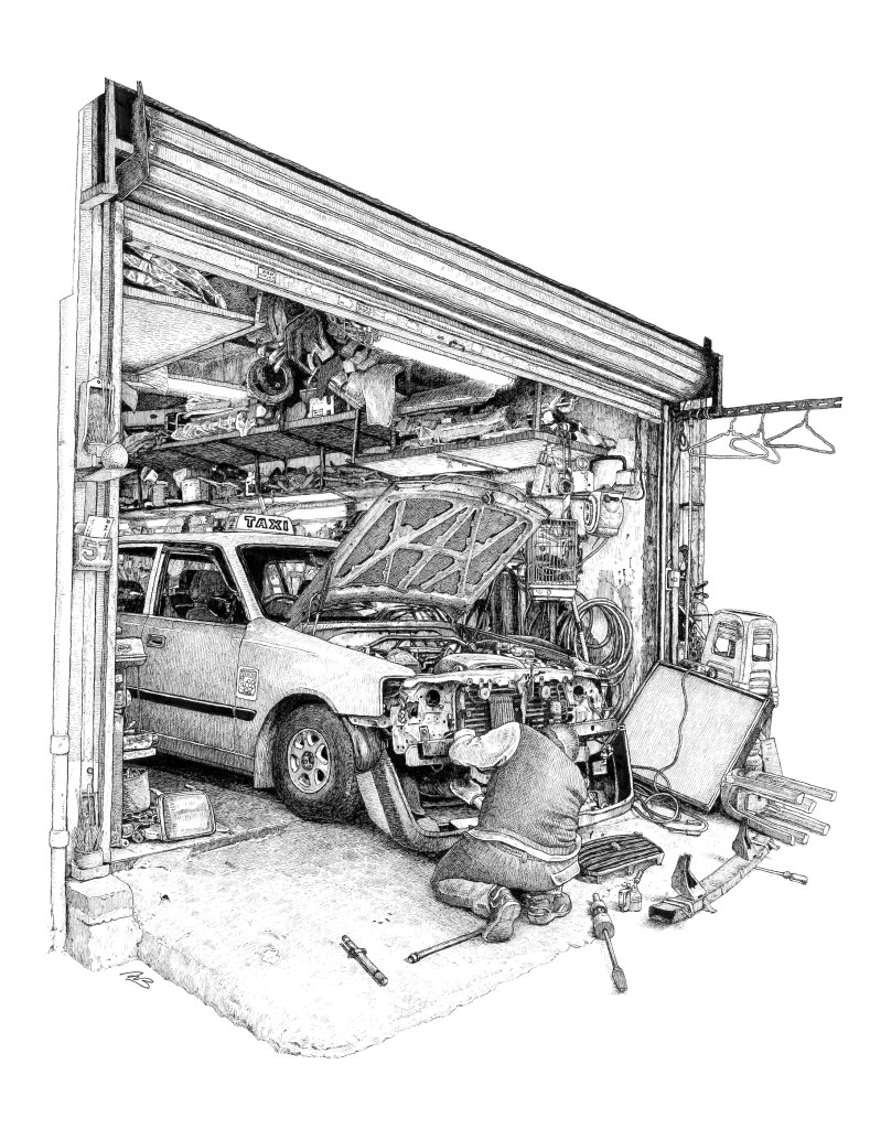 “Taxi Repairs” and “North Point Business” are the latest two highly detailed ink drawings by Andreas von Buddenbrock (aka “The Ink Trail”). The latter is Andreas’s largest Micron pen drawing to date with a size of 75.7cm x 55cm — a big up-scaling from his usual A5-A4 sized works. Both of the drawings will be part of a private group show titled “Ai Yah” in Hong Kong from April 11-18 along with prints of earlier works. Check out closer detail of the two pieces here below.
